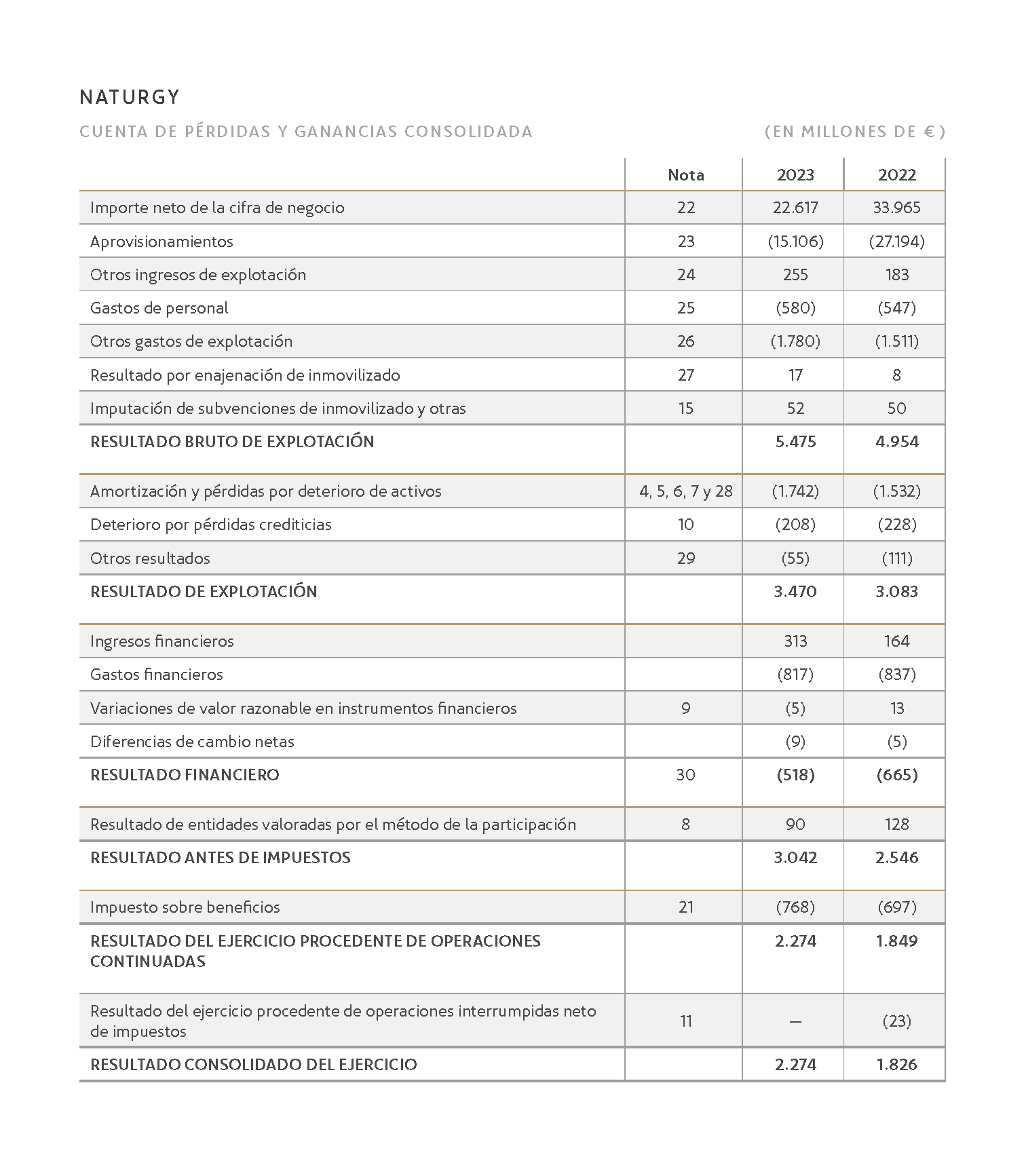 En la siguiente imagen se puede ver la cuenta de pérdidas y ganancias de Naturgy correspondiente a los ejercicios 2022 y 2023.