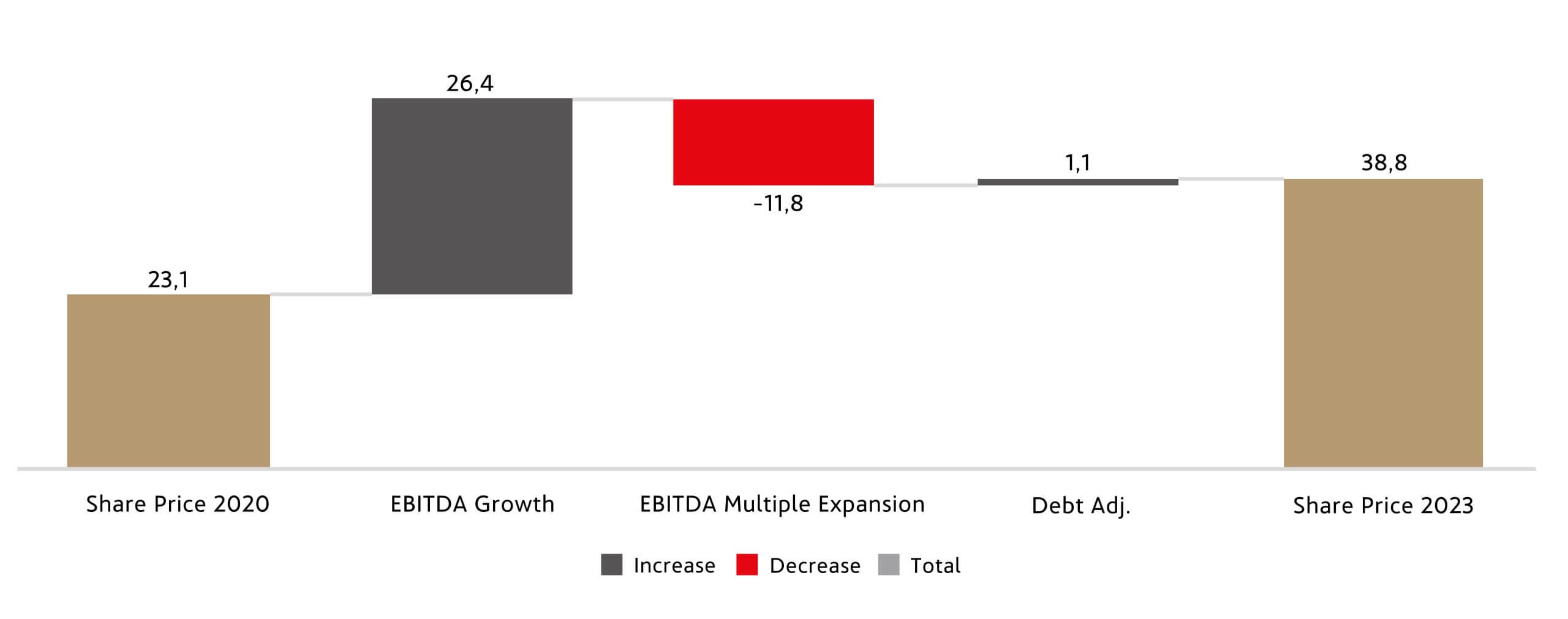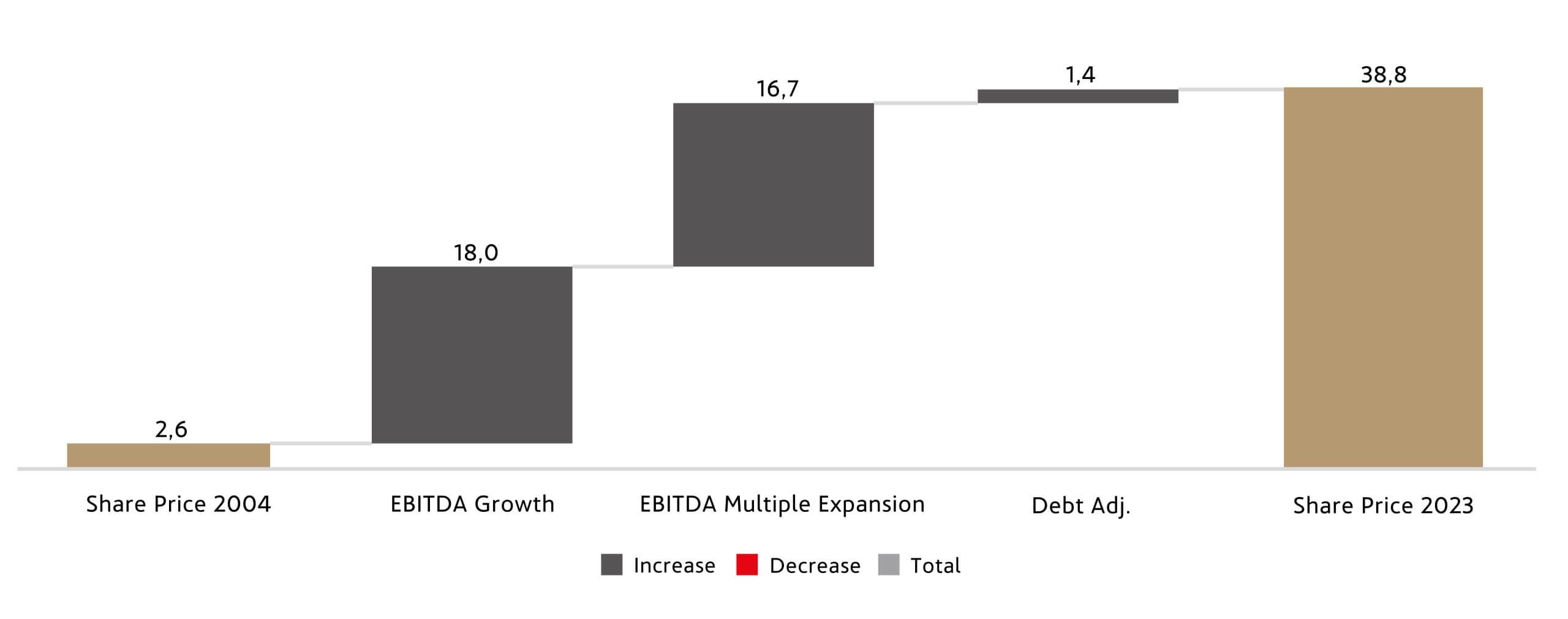 Por tanto, en estos últimos veinte años, los accionistas de Inditex han pasado por periodos muy diferentes. En una primera etapa –la comprendida entre 2004 y 2015– sus títulos fueron impulsados por el efecto conjunto de la buena marcha del negocio y de la expansión de los múltiplos de valoración. En la segunda –entre los años 2015 y 2020–, la caída en la tasa de crecimiento de los resultados de la compañía provocó una contracción de múltiplos y ambos pesaron sobre el precio de la acción. Por último, desde el final de la pandemia hasta la actualidad, aunque los fundamentales de la compañía han vuelto a generar mucho valor, la valoración se ha quedado rezagada.