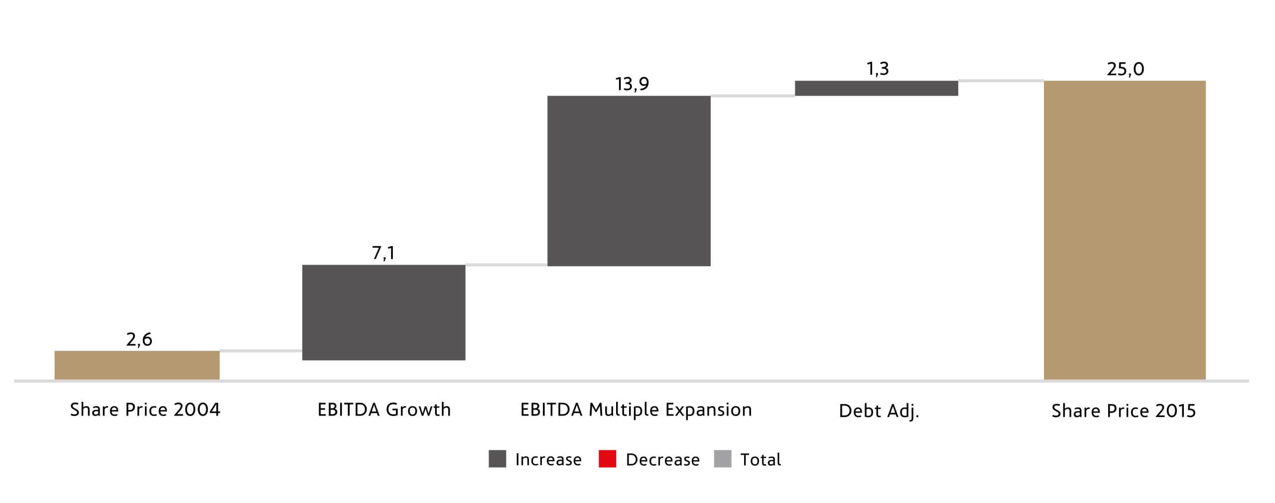 Como podemos ver en el siguiente gráfico, la mayor fuente de rentabilidad para los accionistas entre 2004 y 2015 fue la expansión de los múltiplos. En este periodo, el incremento progresivo de la prima que el mercado estaba dispuesto a pagar por los títulos de Inditex justificó 2/3 de la subida en el precio de la acción. En otras palabras, desde 2004 a 2015, la acción corrió más que los resultados.