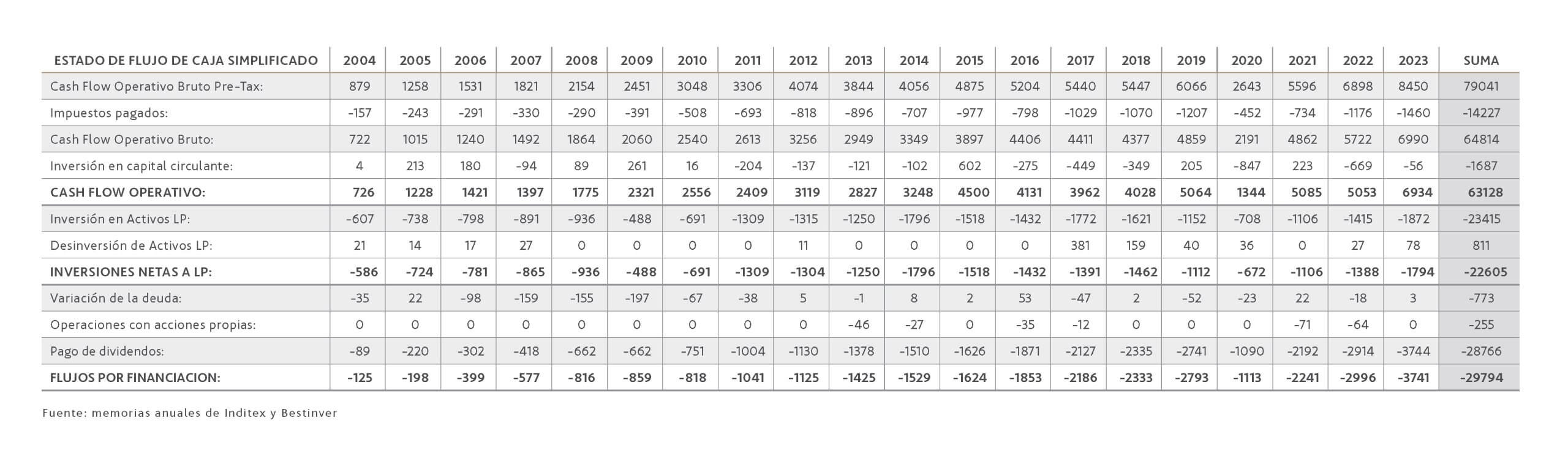 Como podemos ver en la tabla anterior, Inditex ha generado 63.128 millones de euros con sus actividades operativas durante este periodo, después de haber pagado más de 14.000 millones de euros en impuestos e invertido casi 1.700 millones en su circulante. Sus operaciones ordinarias, por tanto, han sido su principal fuente de caja. Una caja que ha empleado principalmente en invertir en su propio negocio para hacerlo crecer de manera orgánica –con 22.605 millones de euros de inversiones netas– y en pagar a sus accionistas casi 28.000 millones de euros en dividendos.
