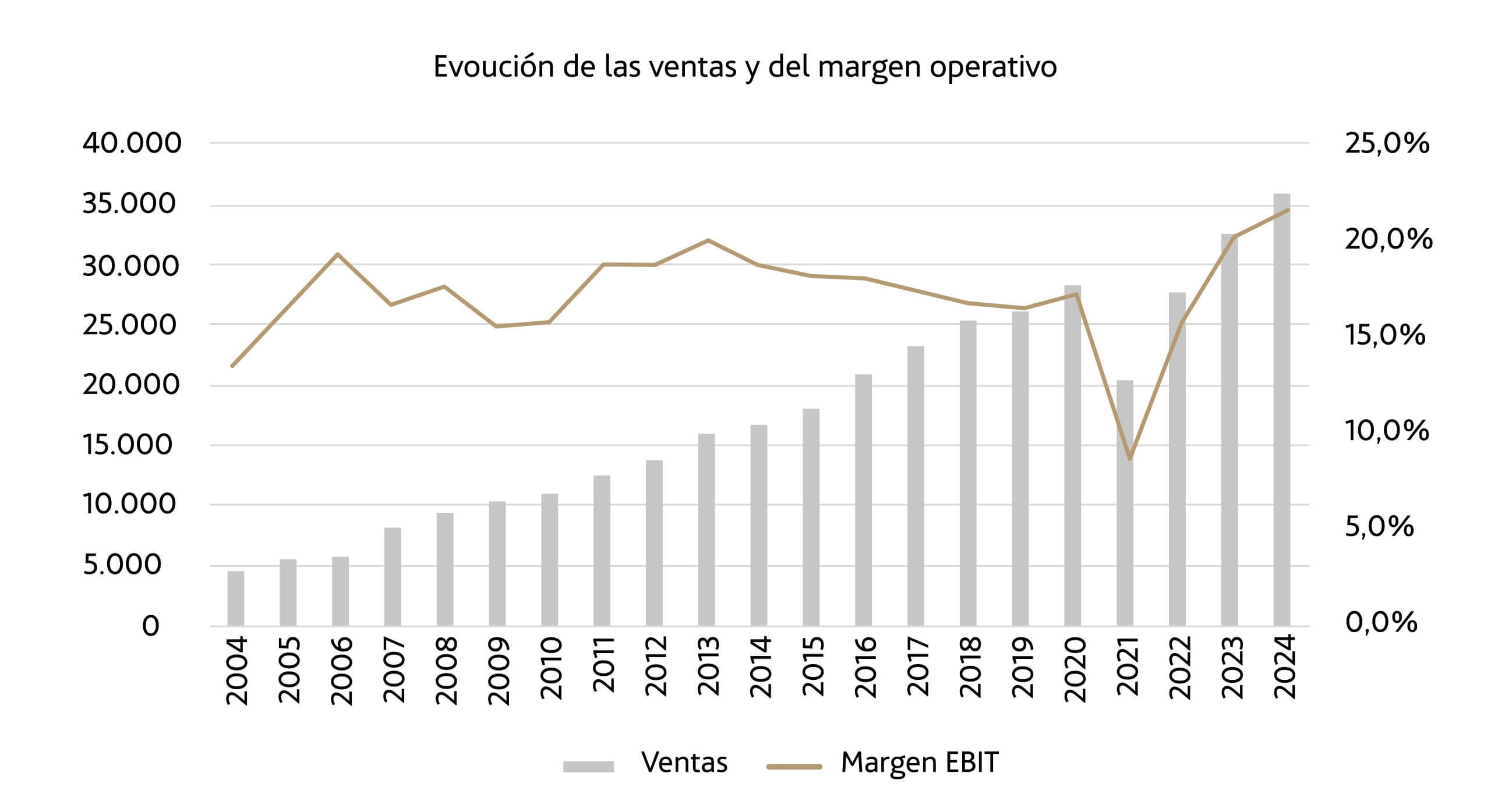 La trayectoria de Inditex durante los últimos veinte años ha sido espectacular. Además de haber conseguido que sus ingresos crezcan a una tasa compuesta del 11% anual, ha sabido proteger sus márgenes operativos y los ha mantenido en los niveles más altos de la industria.