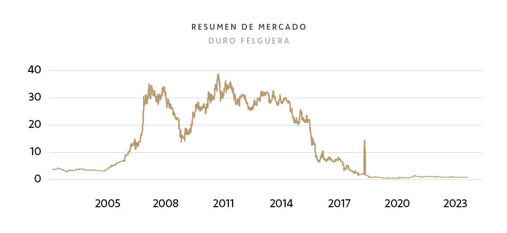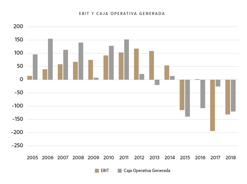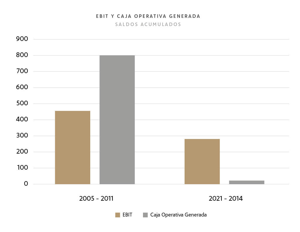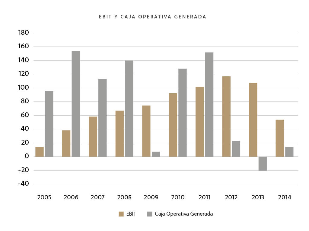 La información contable de Duro reportaba un EBIT acumulado entre 2005 y 2011 de 453 millones de euros y una caja operativa generada de 796 millones de euros. Es decir, una relación de 1,76 veces a favor de la caja. Sin embargo, entre 2012 y 2014, esta se deteriora sensiblemente hasta 0,07 veces, pues reporta un acumulado de 280 millones de euros de EBIT frente a 19 millones de euros de caja operativa. Como muestra el siguiente gráfico, lo que ocurrió entre 2012 y 2014 es que la caja operativa generada por el negocio, básicamente, desapareció.