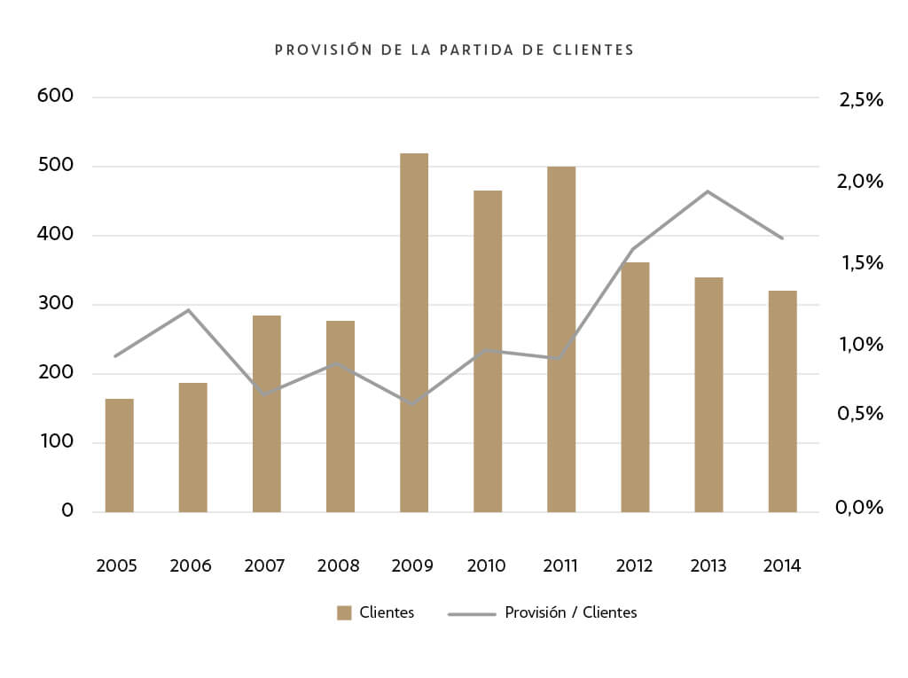 Una última advertencia –pequeña en magnitud, pero grande en significado– era la evolución de la provisión de partidas de clientes de dudoso cobro. A pesar del crecimiento de la cuenta de Clientes y de que los márgenes superiores al 12% en este negocio solo son alcanzables en proyectos de alto riesgo, la provisión por dudoso cobro se mantuvo en niveles muy bajos durante este periodo. Esta es una muestra adicional de lo agresivo que era el planteamiento contable de Duro Felguera. Un analista podría haber concluido con facilidad que la empresa estaba infra provisionando su cuenta de Clientes –como finalmente ocurrió–.