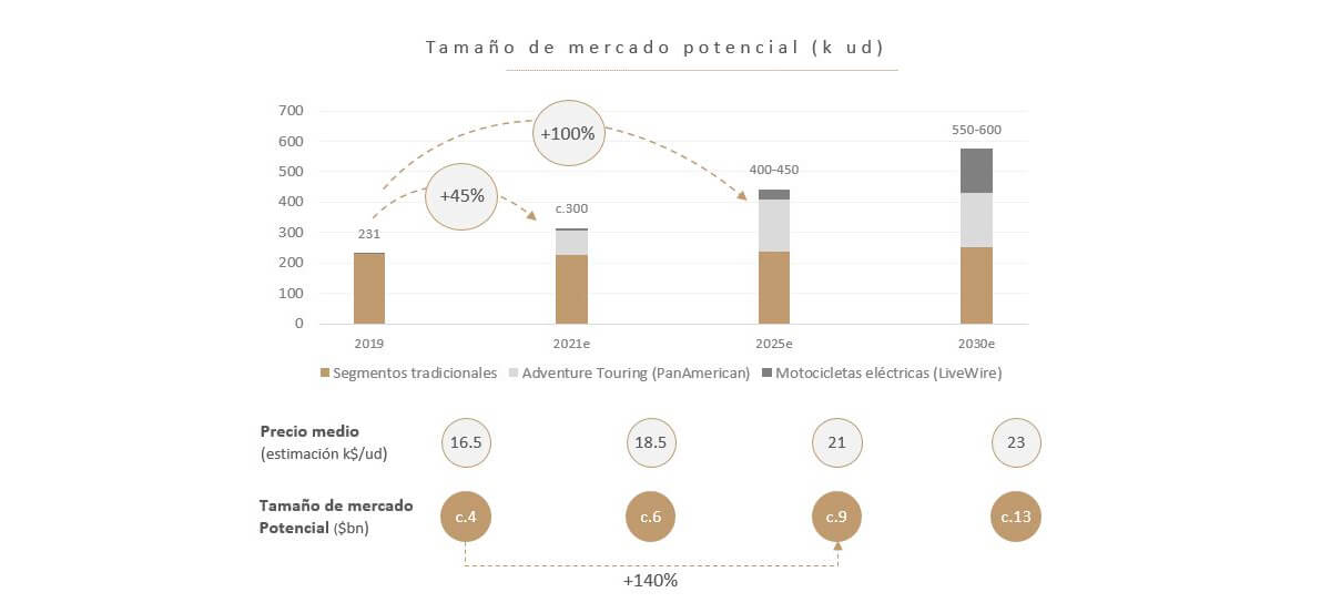 Según nuestras estimaciones, estos dos nuevos modelos y las diferentes iniciativas que se han implementado podrían duplicar el mercado potencial de Harley Davidson en 2025, considerando el efecto positivo tanto a nivel de volumen como en el incremento del precio medio de venta.