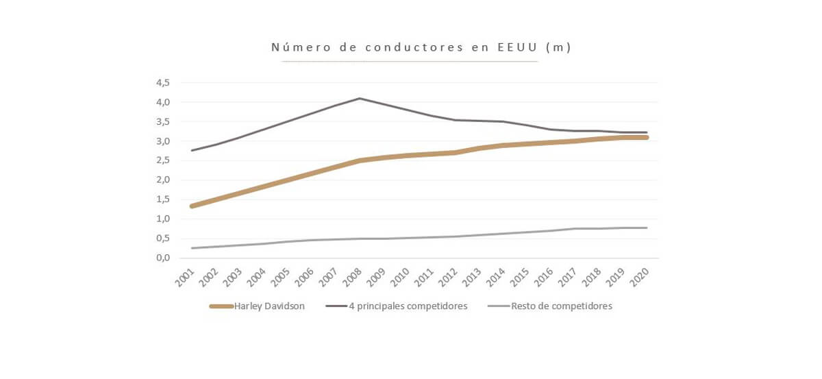En cuanto al primero de los riesgos, hemos analizados datos en Estados Unidos y hemos visto que, por un lado, la penetración de motocicletas Harley ha aumentado en todas las edades cuando comparamos cifras de 2010 con respecto al 2018 (último año para el que se realizó el análisis), incluyendo un incremento del 50% para los conductores más jóvenes, de 18 a 29 años. Adicionalmente, el número de conductores totales no ha hecho sino aumentar en los últimos 20 años, mientras que el de los 4 principales competidores se ha reducido cerca de un 25% tras el pico de 2008. Creemos que el lanzamiento de las nuevas motos, Pan America (aventura o trail) y Livewire (electrica) pueden reforzar estos datos en el medio y largo plazo.