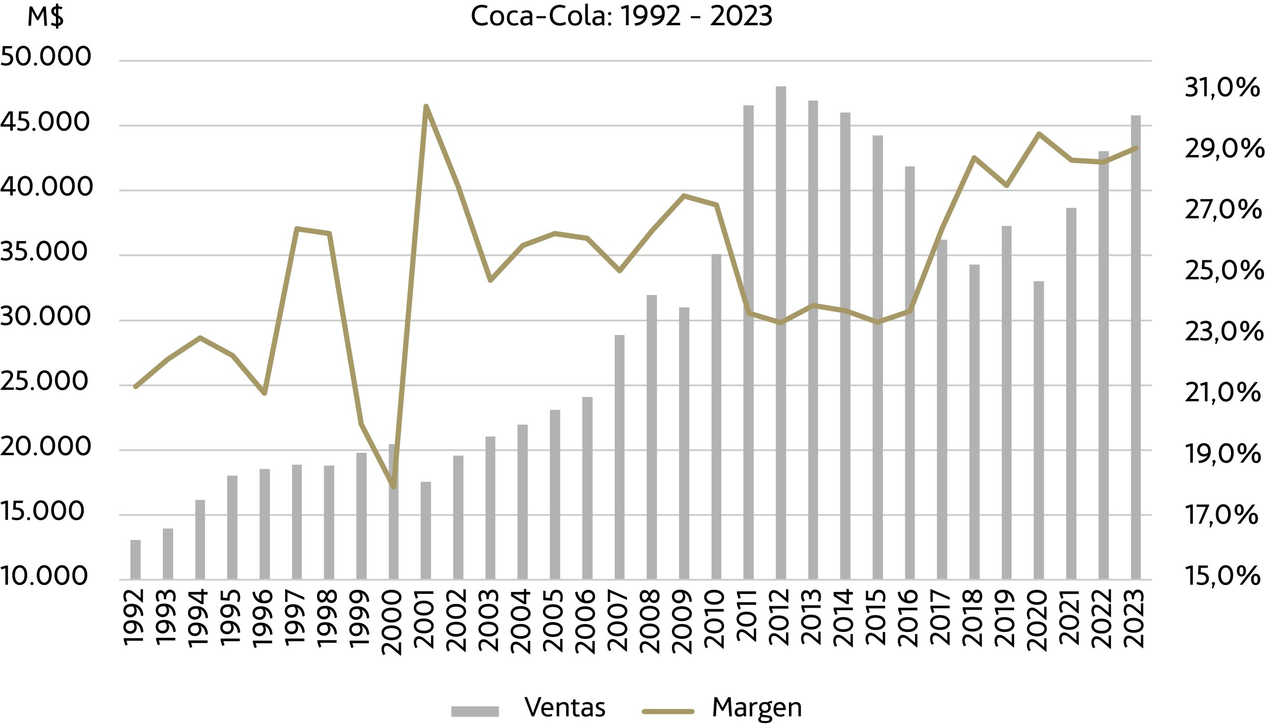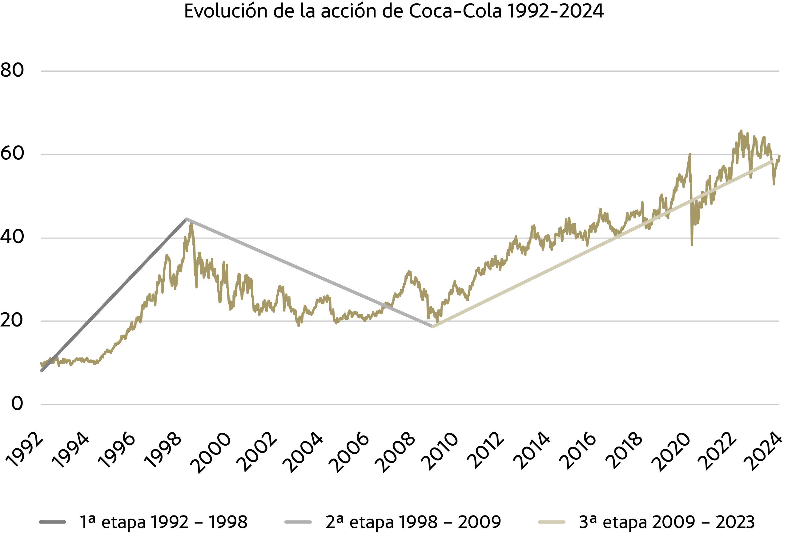 Como inversores en valor, el caso de Coca-Cola[2] aporta lecciones importantes sobre cómo conjugar la calidad del negocio, el largo plazo y la valoración. Así que vamos a examinar en detalle lo que le ocurrió a la compañía de Atlanta entre 1992 y 2023. Para ello, partiremos su evolución en tres etapas: la primera entre 1992 y 1998, la segunda entre 1998 y 2009 y, finalmente, la tercera entre 2009 y 2023.
