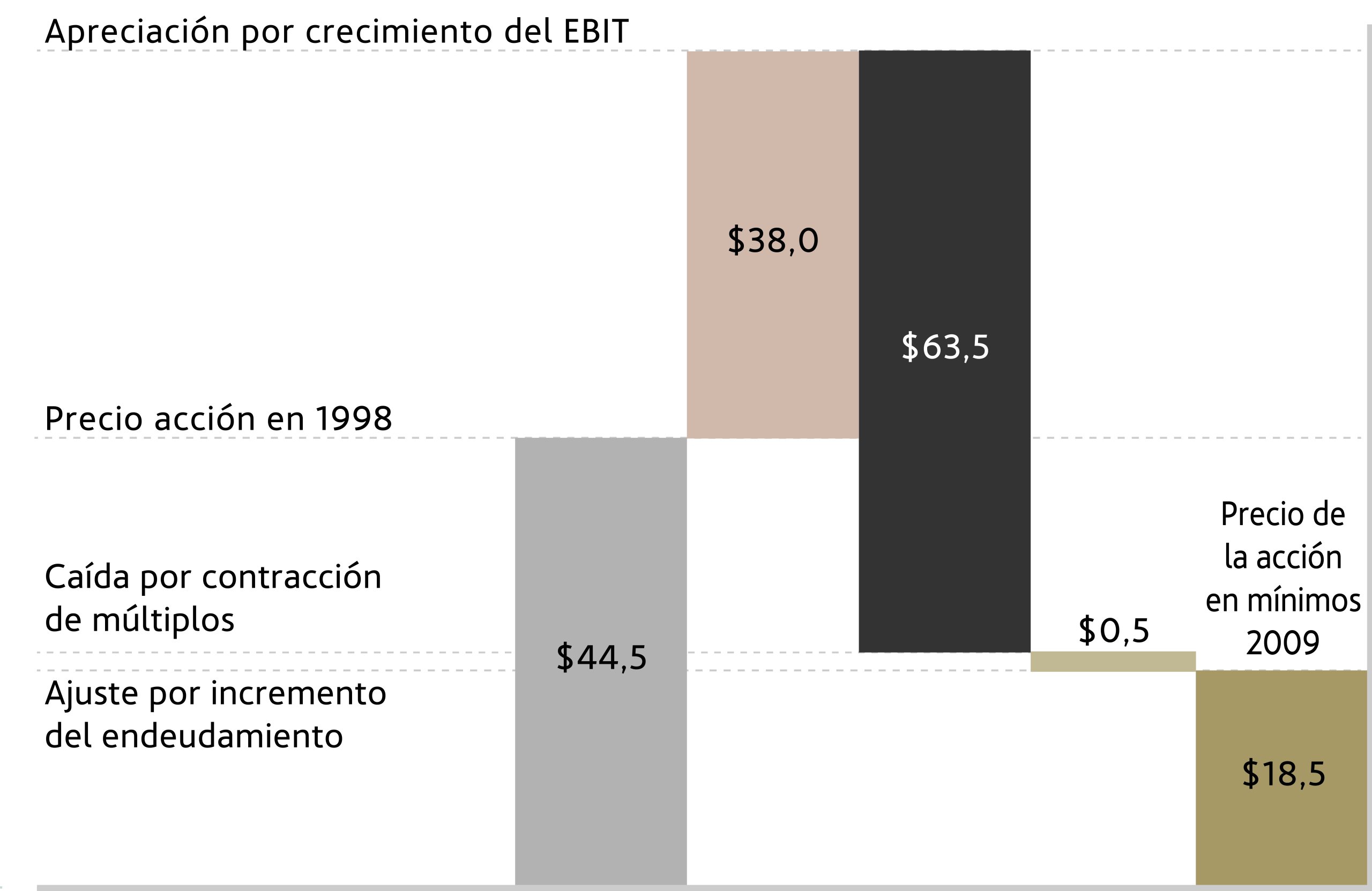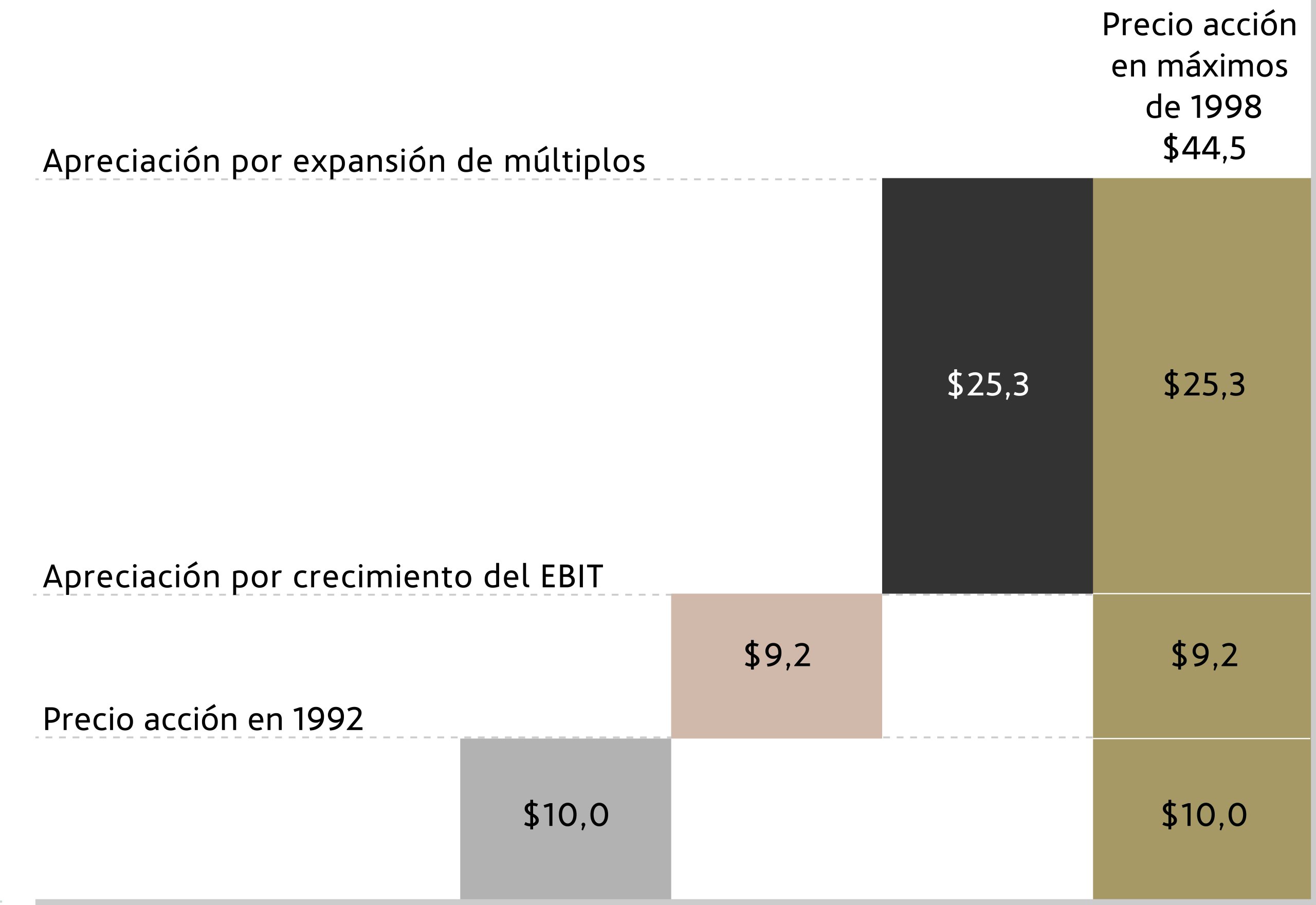 Este buen desempeño operativo se vio reflejado en el comportamiento de la acción, que se apreció desde $10,0 a $44,5. En términos de valoración, esta subida supuso una fuerte expansión de su múltiplo EV/EBIT desde las 19,6 veces en 1992 a las 45,1 veces en el punto máximo de 1998.