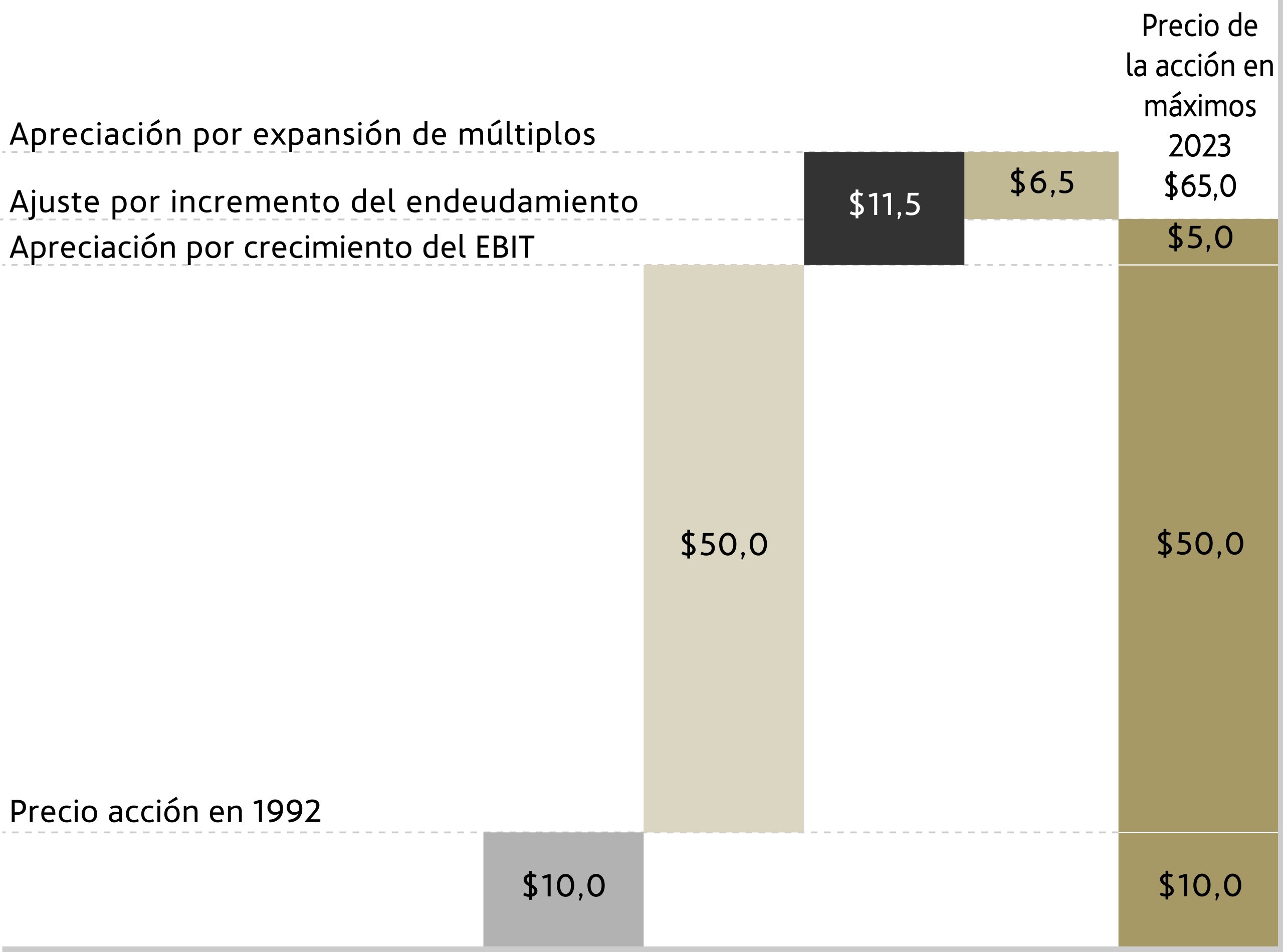 En el siguiente gráfico se desglosa lo que aportó en la apreciación de los títulos de Coca-Cola el crecimiento del EBIT por acción y la expansión de múltiplo. Partiendo de los $10,0 a los que cotizaba al comienzo de 1992, el crecimiento del EBIT explica una subida de $9,2 en el precio de la acción, mientras que la expansión de múltiplos justificó la subida adicional de $25,3. En otras palabras, a pesar de la buena evolución de los fundamentales de la compañía, la mayor parte de la apreciación fue debida a la expansión de los múltiplos de valoración. Es decir, al encarecimiento de su acción.